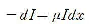 흡수, 산란으로 선속에서 소멸하는 광자수 dN은 물질속에서 광자수 N이 많을수록, 두께 dx가 두꺼울수록 많아짐