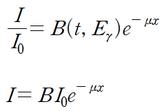 그래서 위 식을 보정한 식으로, 빌드업 팩터(축적계수, 방사선이 차폐제를 통과할 때, 산란으로인한 변수를 적용해 측정한 위치에서 방사선이 증가하는 비율)를 적용하면,